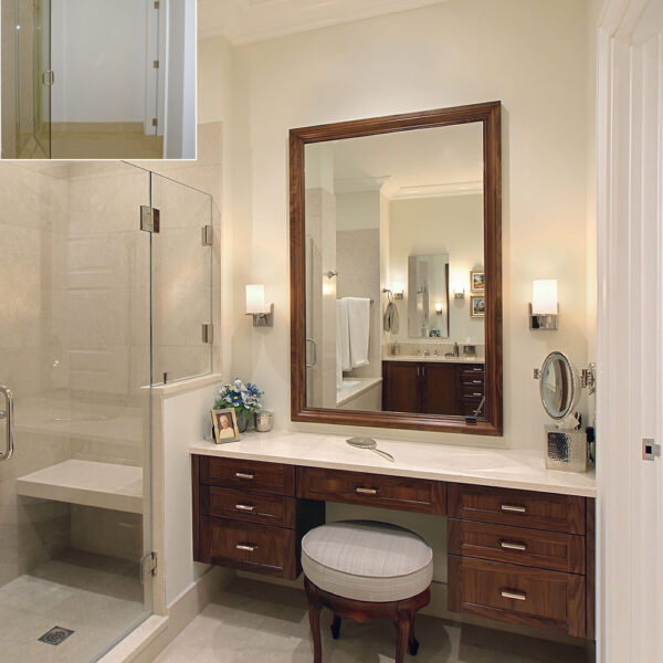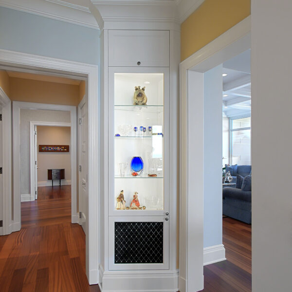 We created a wall of 21 operable panels in the Living Room which has no hardware to conceal the utility hidden behind the finished wall surface. The main bedroom corridor was cut in half to create a master suite that had an entry point separate from the guest rooms. The master suite now has a couple’s office, His and Her walk-in closets and better space utilization in the master bath. The master bath gained 12-feet of custom cabinetry by simply moving a toilet compartment door over by 20”.