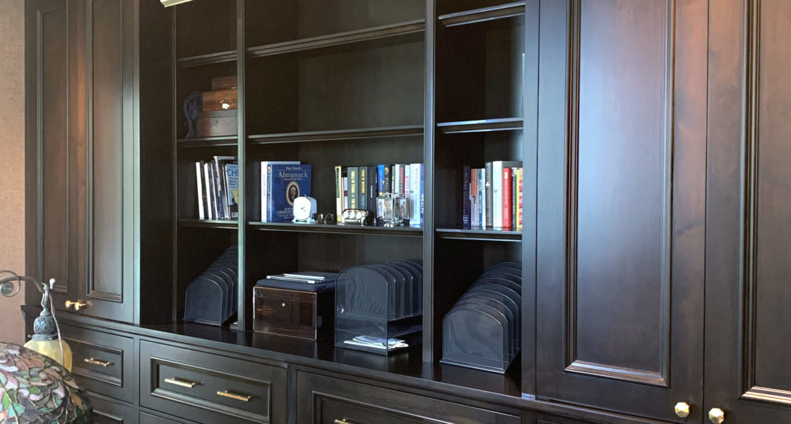 Home office in Winnetka with elegant, dark stained custom cabinetry and built ins gives a formal feel to the space.