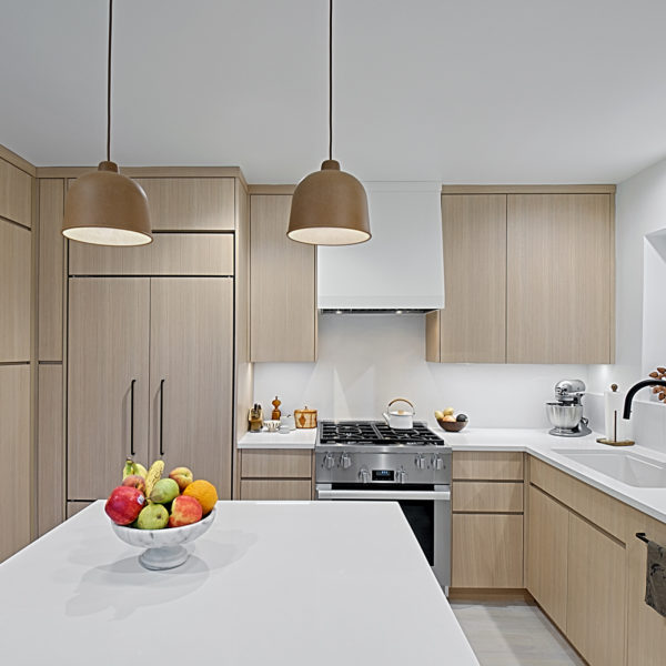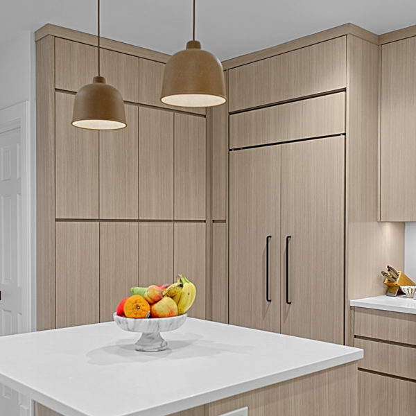 Our attention to detail made use of every inch of space as seen in the 8 inch deep wall pantry and the narrow pocket next to the refrigerator. The rift-cut white oak cabinetry in this modern kitchen remodel in Chicago was custom made in our Evanston cabinet shop.