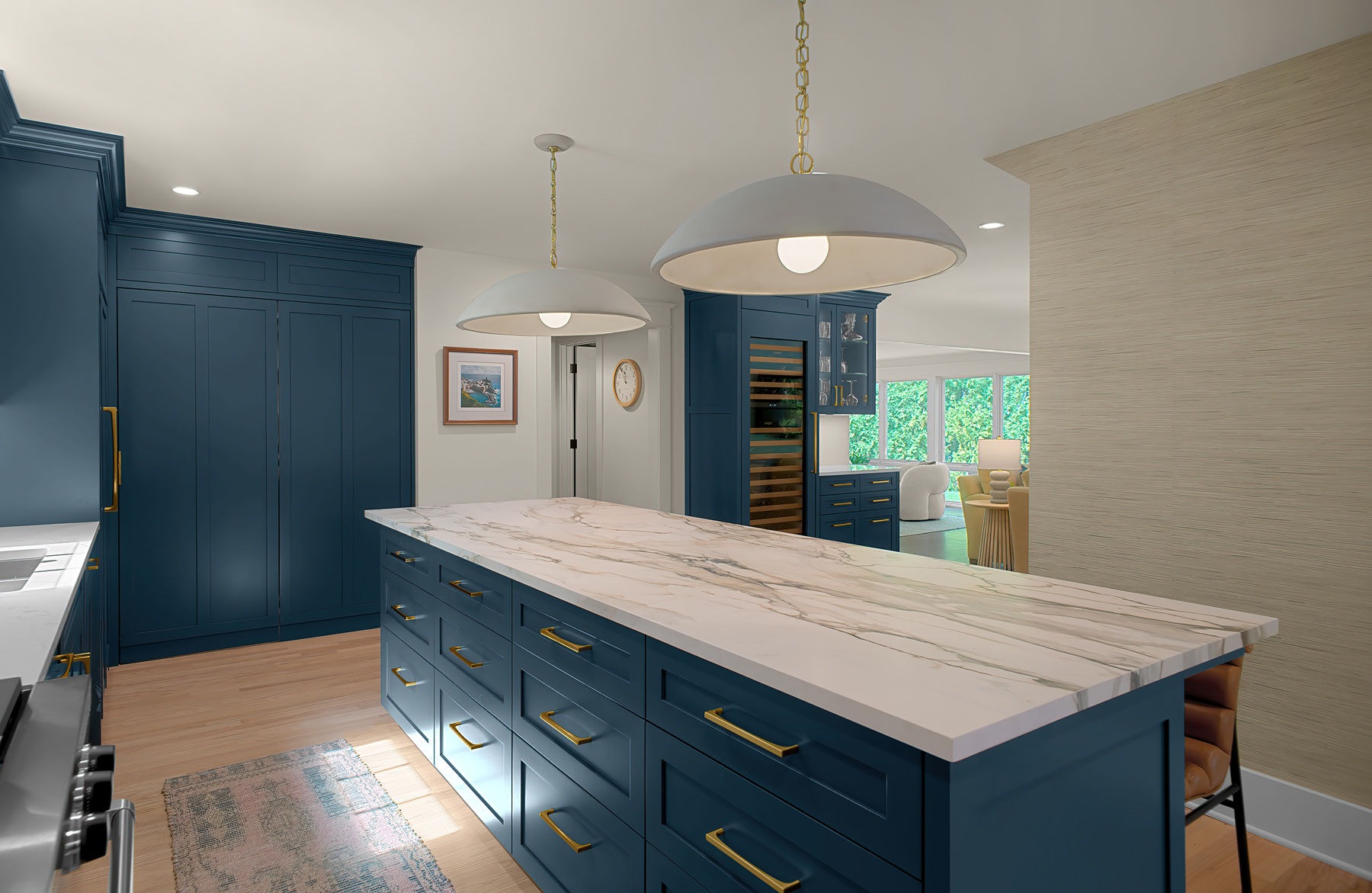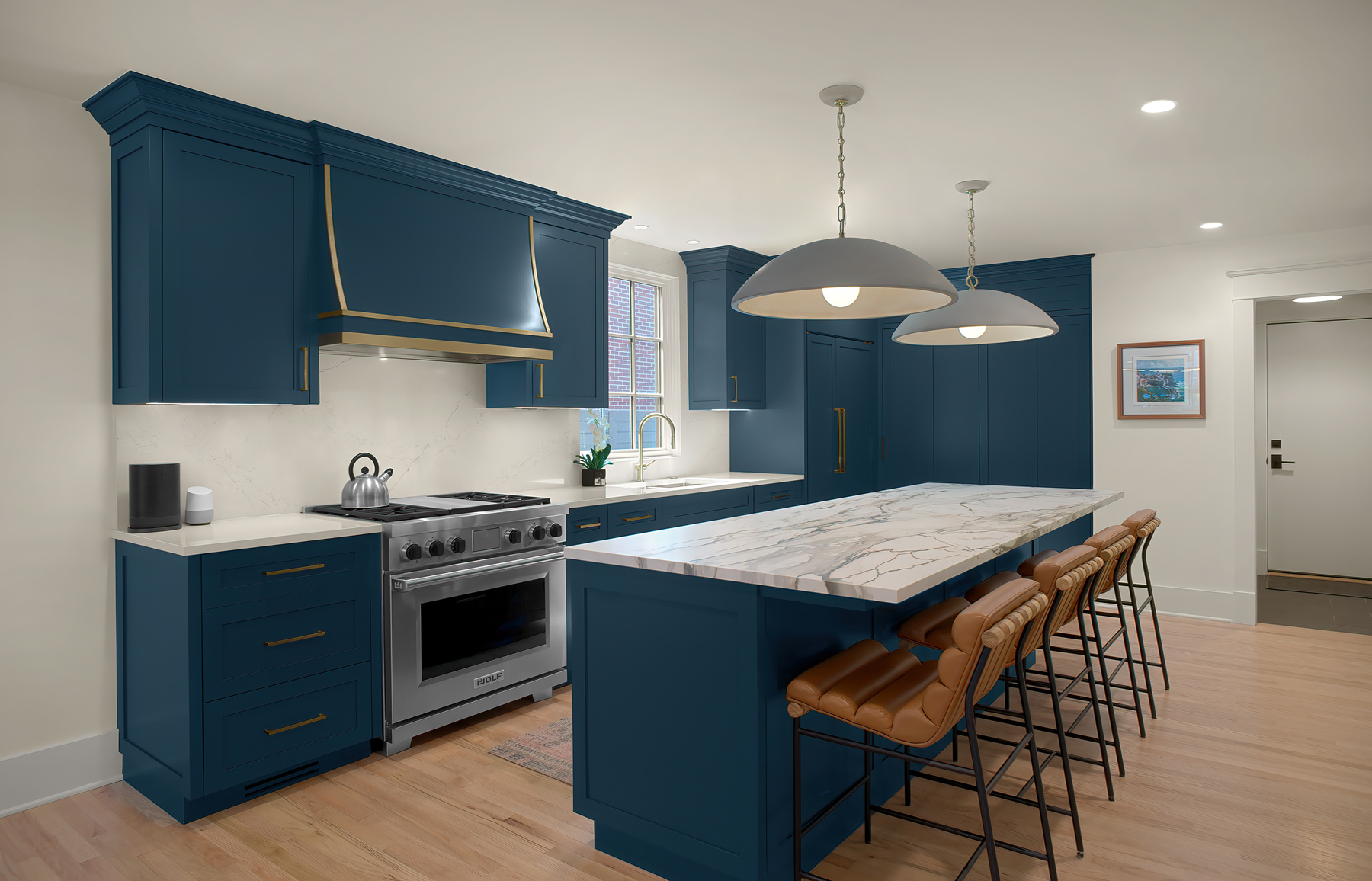 This modern kitchen remodel in Wilmette is a stunning transformation of space, cabinetry and color. A narrow outdated kitchen was replaced with an open concept one featuring custom cabinetry painted deep blue and range hood with brass trim. Quartz countertops and backsplashes provide a seamless flow and a nice contrast. The deeply veined porcelain countertop adds a bit of drama.